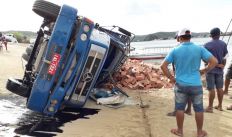 Carregado com blocos, caminhão que seguia para Pão de Açúcar tomba em ponto de balsa