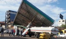 Cobertura de posto de combustíveis desaba sobre caminhão-pipa em Delmiro Gouveia
