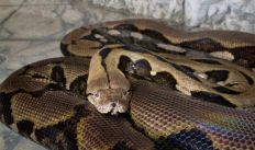 A píton gigante, uma espécie que vive em florestas tropicais, é muito comum na Indonésia e nas Filipinas; costuma se alimentar de pequenos