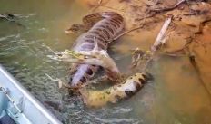 Com cerca de 5 metros, sucuri de barriga cheia surpreende pescadores no Mato Grosso do Sul