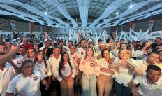 Multidão vestida de branco lotou ginásio esportivo para participar do lançamento das candidaturas