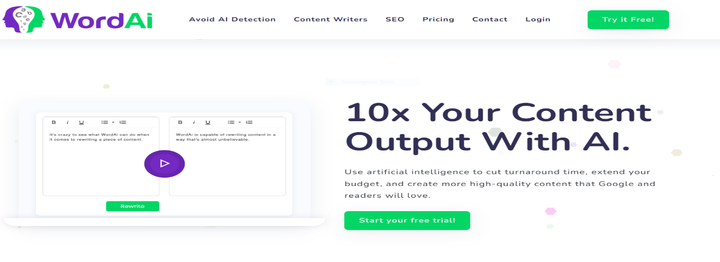 WordAI é uma ferramenta online para gerar conteúdo. Ele usa algoritmos complexos para reescrever o conteúdo e reduzir o tempo rapidamente. Ajuda a reorganizar as palavras, tornar as coisas mais claras e aumentar a qualidade.