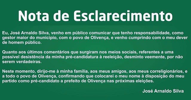 O prefeito de Olivença, José Arnaldo Silva (PSD), conhecido como Zé Arnaldo, divulgou uma nota nas redes sociais, na tarde desta quarta-feira (01), confirmando sua pré-candidatura à reeleição e, ao mesmo tempo, desmentindo os boatos sobre uma possível desistência de disputar o Executivo este ano.