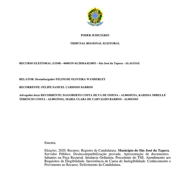 O vereador e candidato à reeleição Felipe Cardoso (DEM) apresentou ao Correio Notícia uma decisão judicial (confira abaixo) que confirma o deferimento da candidatura dele ao cargo, ou seja, a candidatura está válida e mantida.