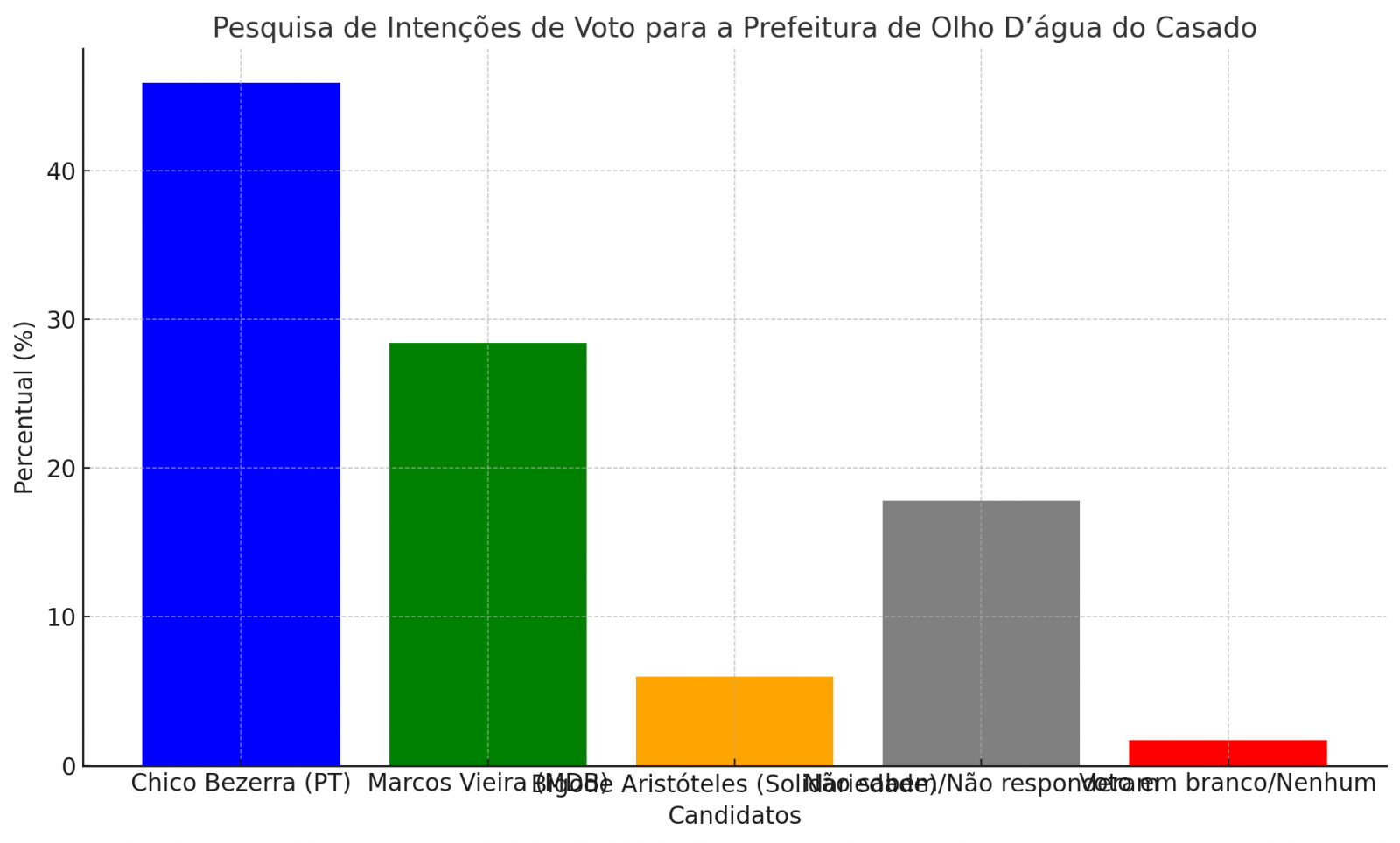 Candidato apoiado pelo atual prefeito tem 45,9% de intenção de votos contra 28,4% de Marcos Vieira e 6% de Bigode Aristóteles
