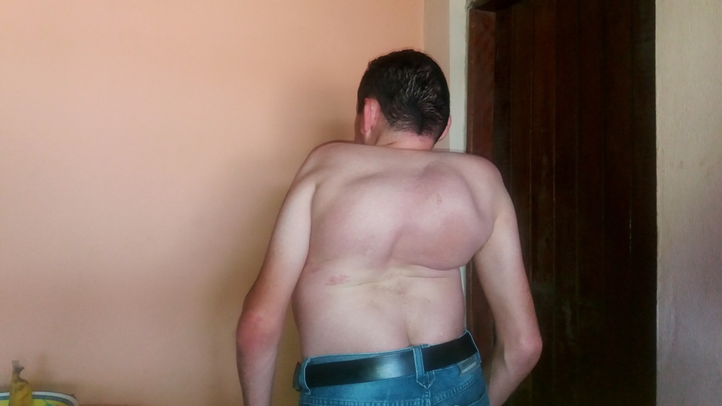 | Dores provenientes da deformidade avançada da coluna vertebral de Jacson Canuto dificulta atividades laborais dele (Crédito: Jota Silva) |