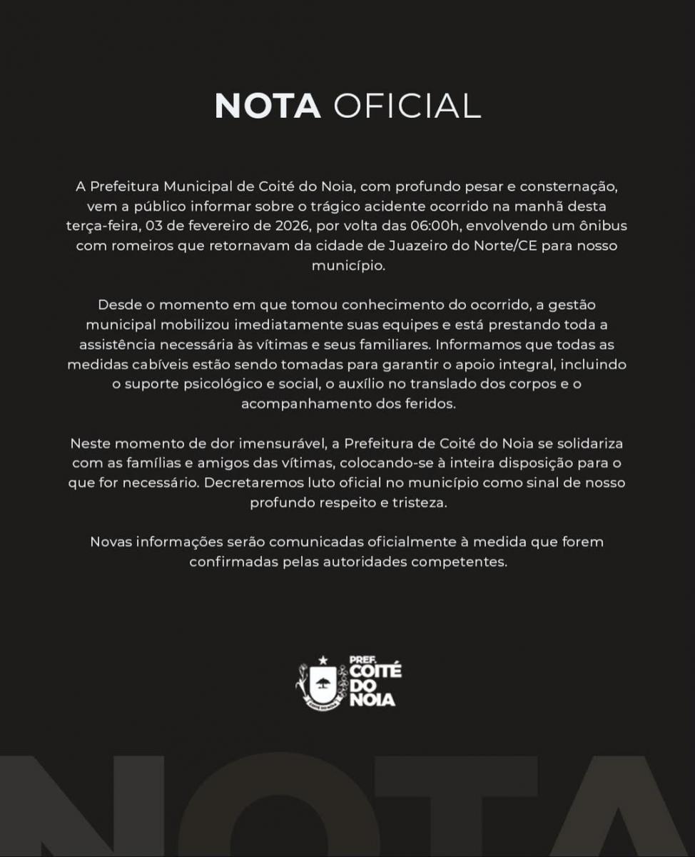 Gestão municipal decretou luto, prestou solidariedade às famílias e confirmou que 16 vítimas perderam a vida no trágico acidente com romeiros que saíram do município