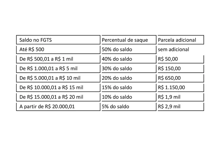 O valor a que o trabalhador que aderiu ao saque-aniversário tem direito a retirar a cada ano depende do saldo em cada conta do FGTS. Para contas com saldo de até R$ 500, poderão ser retirados 50% do total. A partir daí, o percentual cai, mas será pago um valor fixo adicional, que aumenta conforme o saldo total. O cálculo ocorre da seguinte forma:
