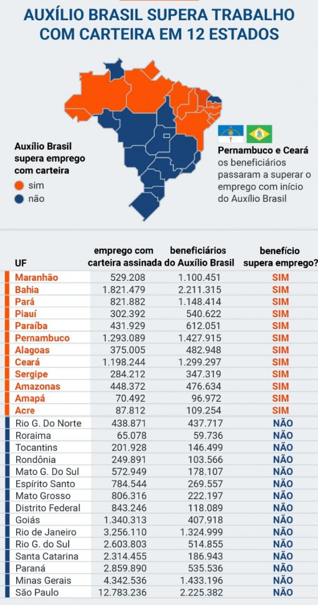 Dados de fevereiro de 2022 (os mais recentes até agora para o emprego) mostra que todos os Estados onde o número de beneficiários do Auxílio Brasil supera o de empregados com carteira estão nas regiões Norte e Nordeste.