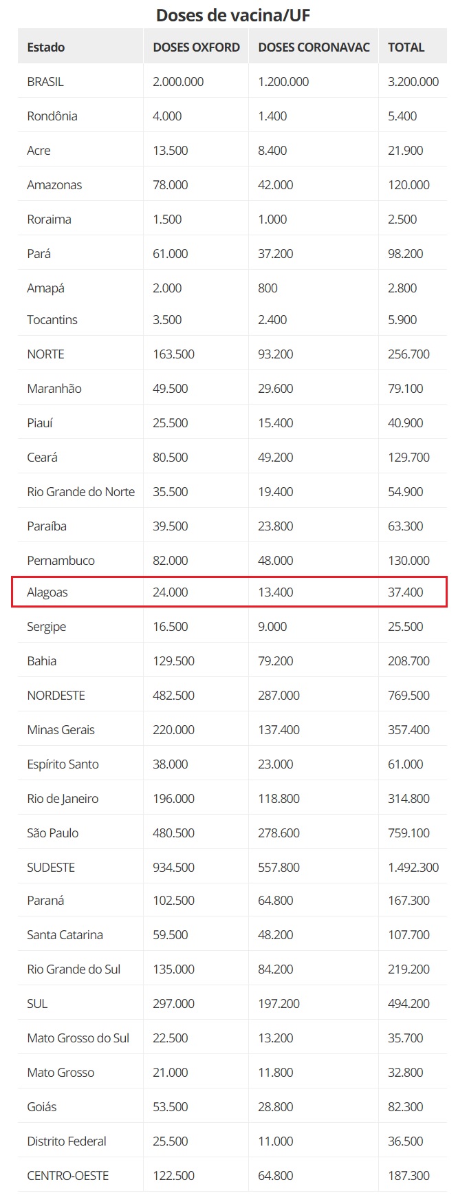 O Ministério da Saúde não informou quando as doses chegarão a cada estado.