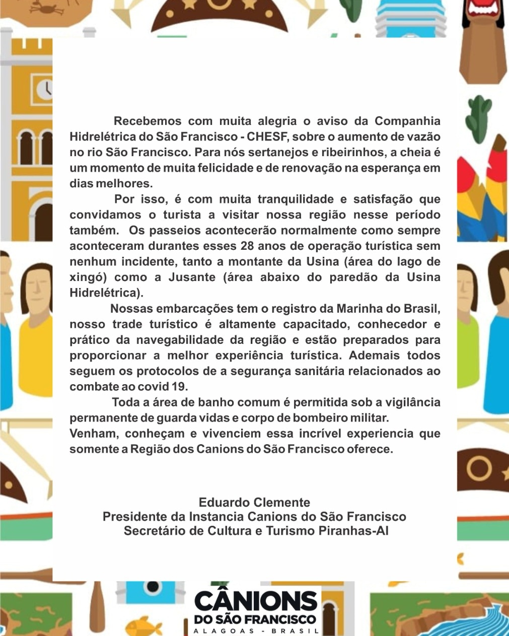 Ainda de acordo com informações oficiais, não existe risco por conta da vazão da represa de Xingó