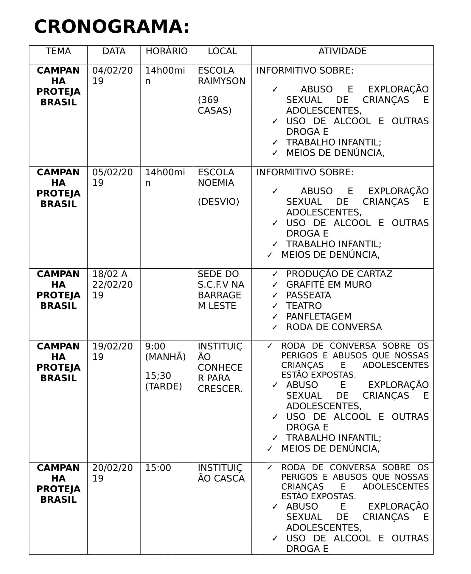 A mobilização teve início na Escola Municipal Professor Raimyson Silva Nascimento, e se estenderá para a Escola Municipal Noêmia Bandeira e no Serviço de Convivência e Fortalecimento de Vínculos do Distrito Barragem Leste, com o objetivo de conscientizar a sociedade sobre a importância de prevenir e combater as violações mais recorrentes em grandes eventos.