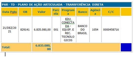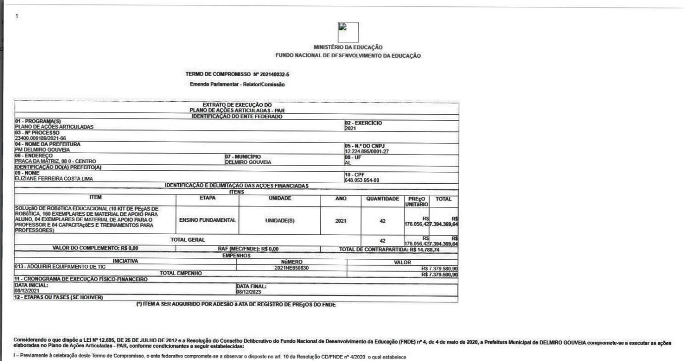 O Município foi beneficiado com recursos do governo federal para comprar Kits Robótica, no valor de R$ 7.394.369,64 (sete milhões, trezentos e noventa e quatro mil, trezentos e sessenta e nove reais e sessenta e quatro centavos), exatamente. Veja quadro abaixo:
