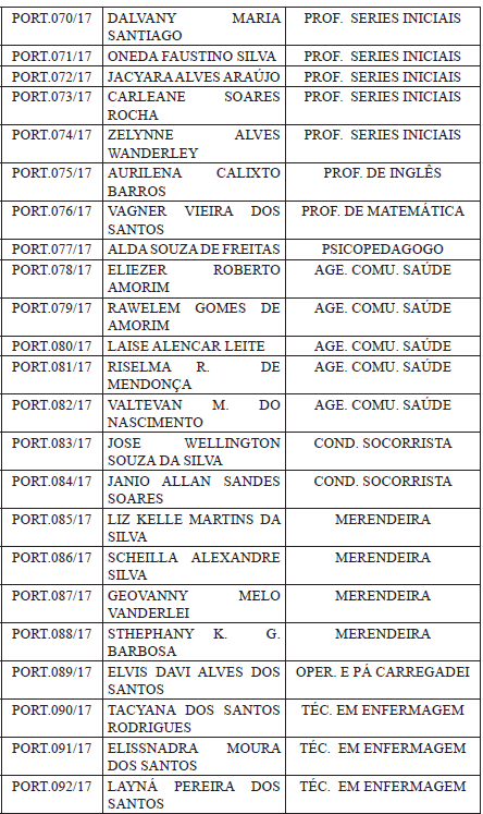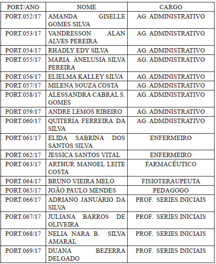Os candidatos foram nomeados para assumir 19 cargos diferentes, entre eles: agente administrativo, terapeuta ocupacional, assistente social, coveiro, pedreiro, merendeira, auxiliar de cozinha, técnico de enfermagem, operador de pá carregadeira, condutor socorrista, agente comunitário de saúde, psicopedagogo, professor, enfermeiro, farmacêutico, fisioterapeuta e pedagogo.
