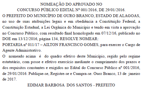Confira abaixo a lista completa dos nomeados pela prefeitura de Ouro Branco.