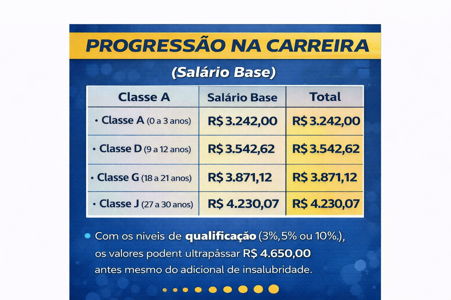 Com os níveis de qualificação (3%, 5% ou 10%), os valores podem ultrapassar R$ 4.650,00 antes mesmo do adicional de insalubridade.