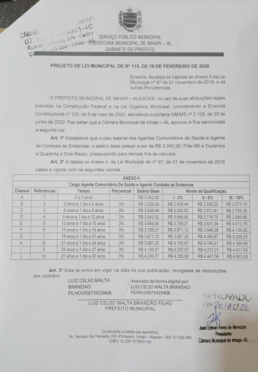 O município de Inhapi agora figura entre as cinco cidades de Alagoas que melhor remuneram os Agentes Comunitários de Saúde (ACS) e Agentes de Combate às Endemias (ACE). A conquista veio após a aprovação unânime do Projeto de Lei nº 115/2026, que atualiza o Plano de Cargos, Carreira e Vencimentos (PCCV) da categoria.