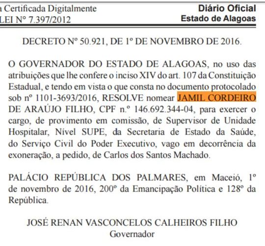 O cargo comissionado que Jamil assume pela segunda vez é de supervisor de unidade hospitalar, vago em decorrência da exoneração de Carlos dos Santos Machado, que, por motivo desconhecido, pediu para deixar a função.
