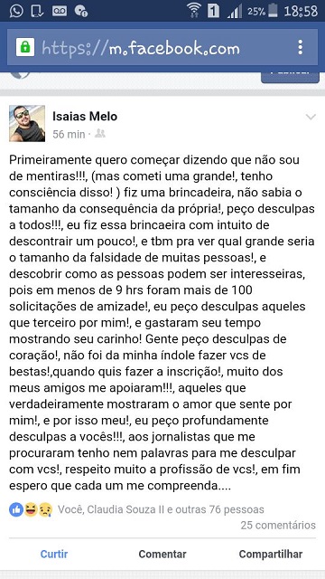 | Postagem na qual Isaias Melo admite que mentiu sobre participação no BBB 17 (Imagem: Reprodução/Facebook) |