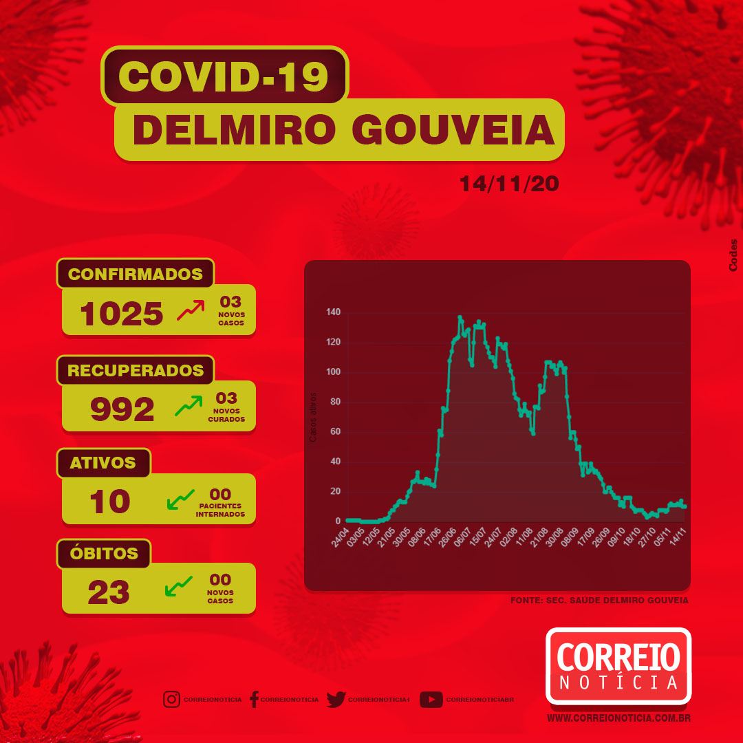 Do número total de casos, 23 entraram em óbito e 992 já estão clinicamente recuperados, ou seja, existem 10 casos ativos, todos se recuperando em casa. Existem dois óbitos suspeitos da síndrome gripal causada pelo novo coronavírus aguardando exame laboratorial.