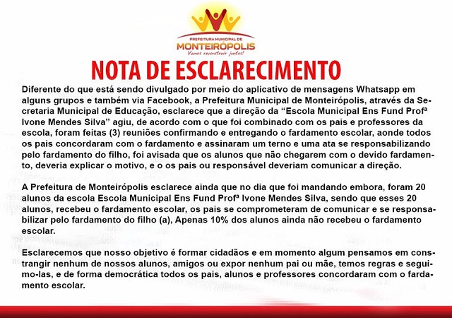 A Prefeitura de Monteirópolis publicou uma nota no Facebook, nesta quinta-feira (27), na qual explica por que razão uma criança de 8 anos de idade foi mandada embora da Escola de Ensino Fundamental Professora Ivone Mendes Silva, na quarta-feira (19) da semana passada.