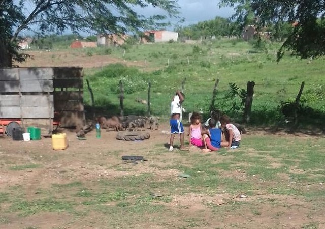 Segundo ele, criatório instalado há quatro meses fica dentro da cidade e provocou o surgimento de moscas nas residências; foto mostra crianças brincando ao lado dos porcos