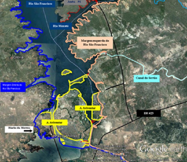 | Imagem do Google mostra áreas circuladas pela linha amarela, em Paulo Afonso, que fazem parte do território de Delmiro Gouveia, segundo pesquisa (Foto: Google Earth) |