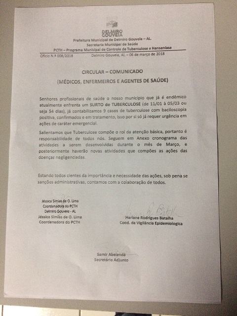 Secretaria de Saúde confirma que Delmiro Gouveia passa por surto de tuberculose