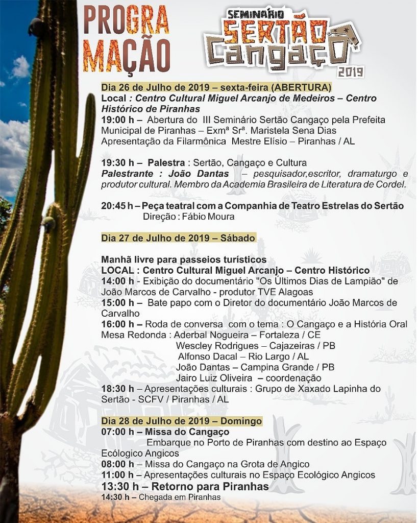 O município de Piranhas irá sediar nos dias 26, 27 e 28 a edição do Seminário Sertão Cangaço 2019. A abertura será na sexta-feira, 26, no Centro Cultural Miguel Arcanjo de Medeiros a partir das 19h.