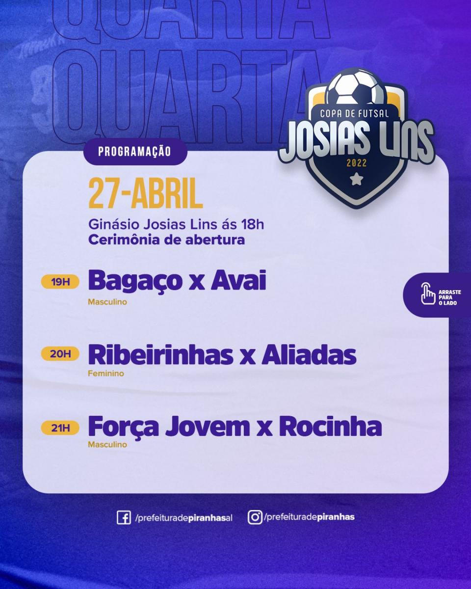 A Secretaria Municipal de Esporte e Eventos, com apoio da Prefeitura de Piranhas, estará realizando a 1ª Copa Josias Lins de Futsal Masculino e Feminino, entre os meses de abril a julho. A solenidade de abertura e estreia esta marcada para a próxima quarta-feira, dia 27, às 18h no ginásio poliesportivo Josias Lins.