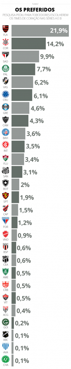 Foram 1.600 respostas pela internet entre 6 e 20 de abril, em respostas captadas em 640 municípios em todo o país - leia sobre a metodologia da pesquisa mais abaixo. A margem de erro é de 2% na consulta da empresa especializada em pesquisas políticas que pela primeira vez fez consulta sobre tamanho de torcidas.