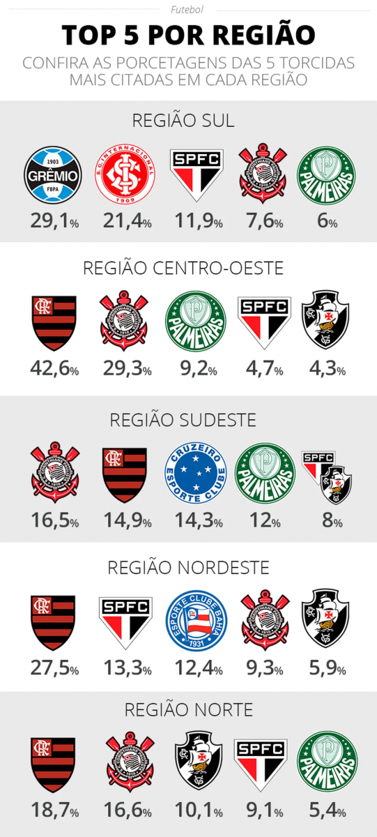 A pesquisa discriminou preferências por gênero, escolaridade, renda familiar, regiões do país, faixa salarial e até religião. No Sudeste, a liderança é do Corinthians, um pouco à frente do Flamengo. Os rubro-negros só não lideram em duas regiões - a outra é a Sul, que tem Grêmio e Internacional com mais da metade da preferência e os flamenguistas em sexto lugar.