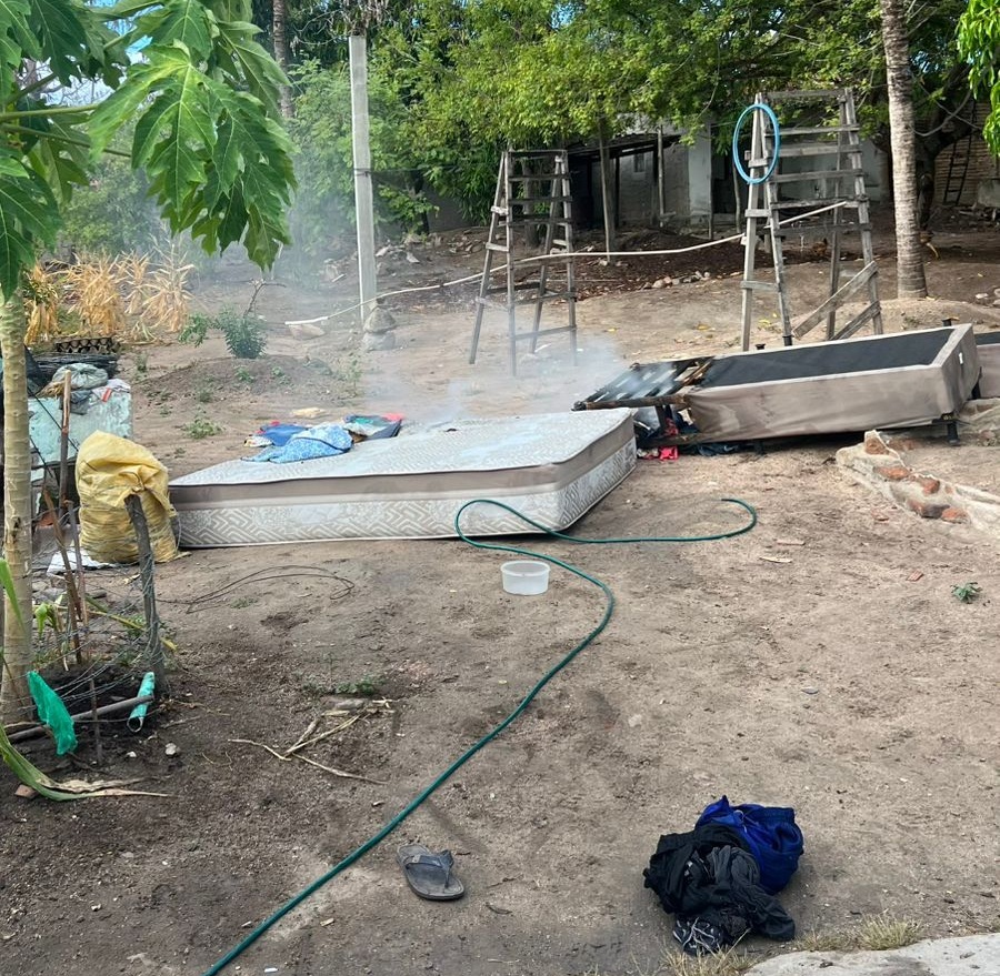 De acordo com o boletim de ocorrência, a Polícia Militar foi acionada via Copom para verificar uma denúncia de violência contra a mulher. Guarnições da Força Tarefa (FT02), Pelotão de Operações Especiais (Pelopes) e Radiopatrrulha (RP01) se deslocaram até o local e encontraram a casa da vítima vazia, com móveis e eletrodomésticos quebrados. No quintal, um colchão estava em chamas e foi rapidamente apagado pelos militares.