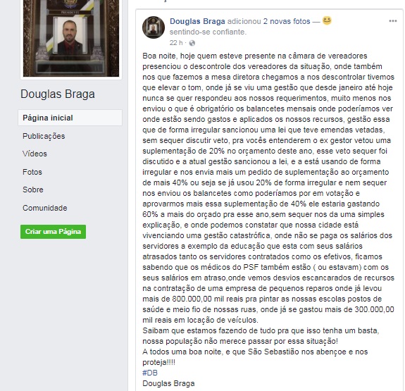 Presidente da Câmara de Vereadores de Monteirópolis, Douglas Braga, usou uma rede social para denunciar que atual gestão do município ainda não enviou os balancetes mensais