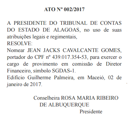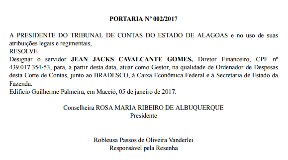 Dois dias depois da nomeação, conforme a portaria 002/2017, publicada no DOE/TCE-AL na edição do dia 5, a presidente do Tribunal de Costas do Estado de Alagoas designou Jean Gomes para a função de Ordenador de Despesas do referido Tribunal junto ao Bradesco, à Caixa Econômica Federal e à Secretaria de Estado da Fazenda (Sefaz).