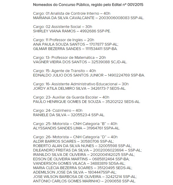 Eles vão ocupar os seguintes cargos: analista de controle interno, assistente social, professor de inglês, professor de matemática, agente de trânsito, assistente administrativo educacional, auxiliar de guarda escolar, cozinheiro e motorista.