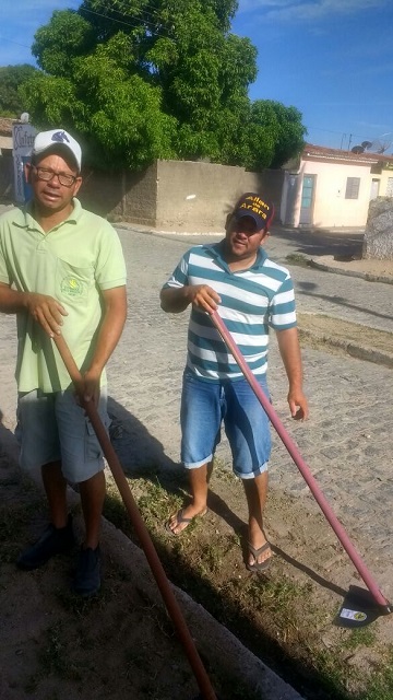 | Vereador Allan da Arara (à direita) usa boné personalizado com o próprio nome e uma enxada nova no primeiro dia de trabalho (Foto: Reprodução/Whatsapp) |