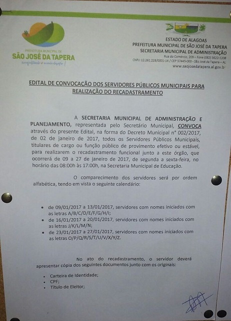 São José da Tapera: prefeito convoca servidores para recadastramento e gera apreensão