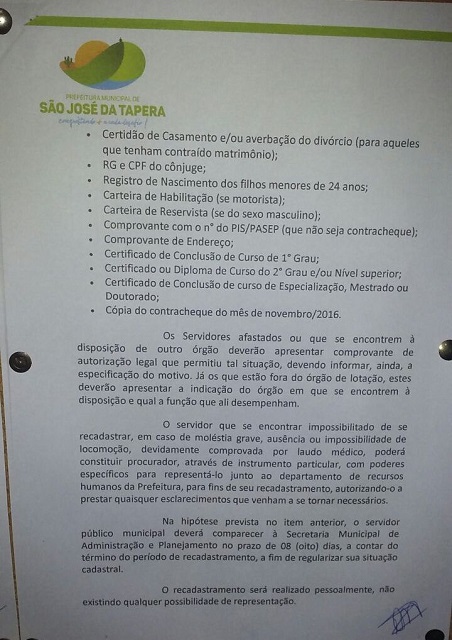 Servidores de São José da Tapera devem fazer o recadastramento até o dia 27 deste mês. Foto: Diego Barros